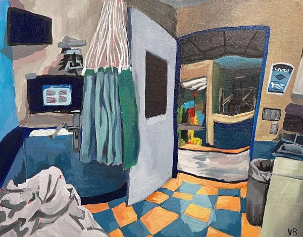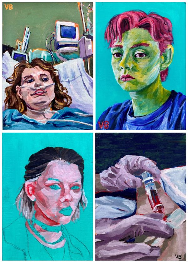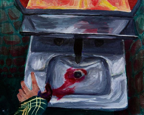 Self-portrait lying down in coffin, still staring at phone. Representing how even at death you won't give yourself the relief of rest.